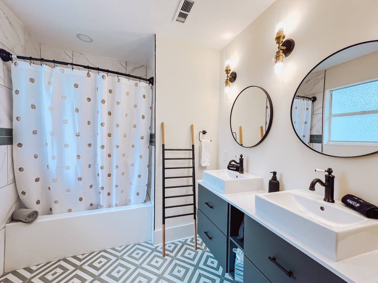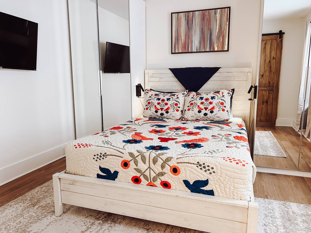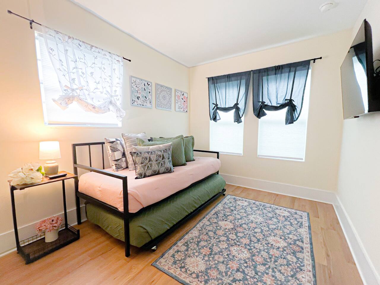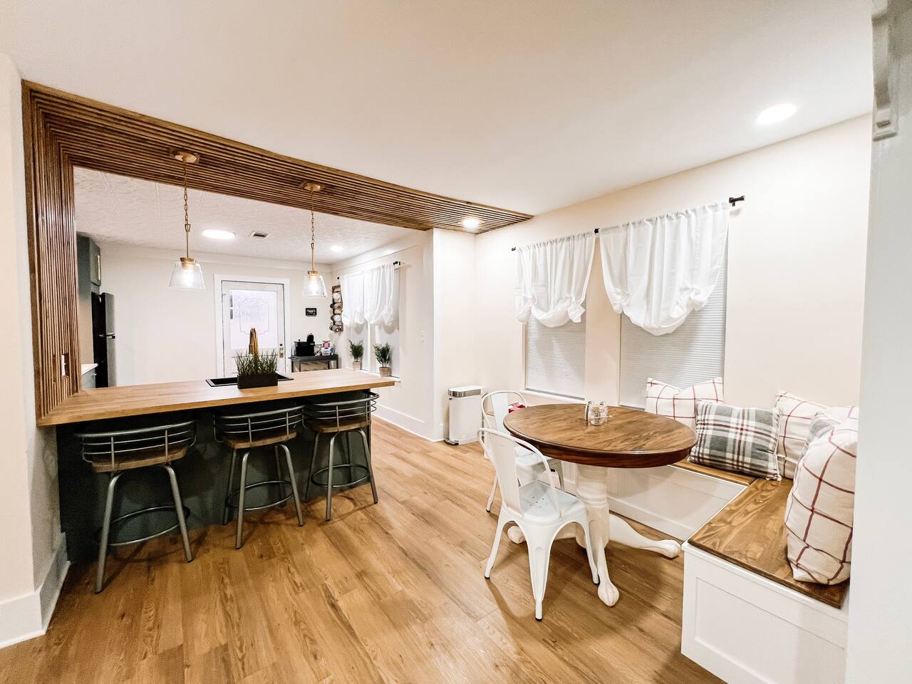 This newly renovated home offers (3) bedrooms and (2) full bathrooms. The master bedroom has an ensuite bathroom complete with dual vanities and towel warmer. The bunk room has a full size bed on the bottom, large enough for (2) people and a twin bed up top. The final bedroom features a twin day bed with trundle bed underneath. Enjoy the mudroom when you enter the home which is equipped with a reading nook, pet area, and IG worthy selfie station. Relax in the living room in front of the electric log fireplace and snuggle up for your favorite movie. You will enjoy all the creature comforts of home including full size washer dryer, fully equipped kitchen, coffee nook stocked with assortments of tea, cider, and coffee, back yard firepit, and charcoal grill. Even your fur babies will feel right at home with soft dog beds, bowls, treats, and crates provided.